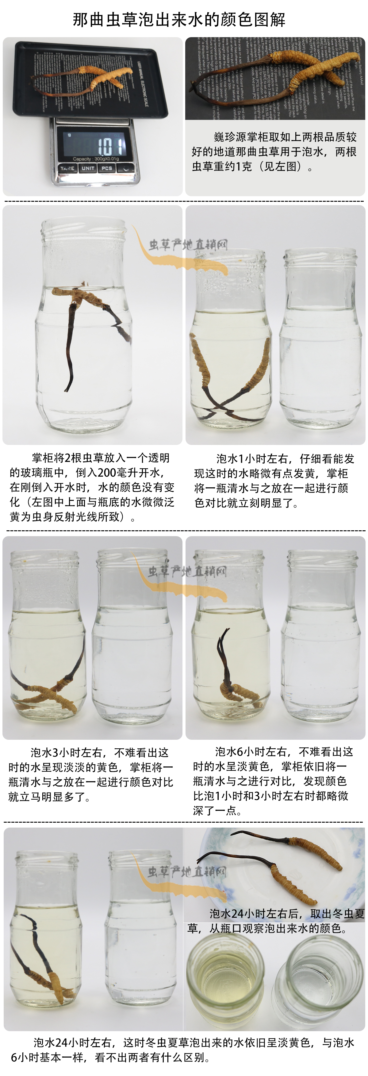 冬蟲夏草泡水是最常用的服用方法,有些細(xì)心的顧客在冬蟲夏草泡水過程中觀察水的顏色變化,并向我們提出了一些疑問。為了掌握第一手資料,更客觀準(zhǔn)確的回答大家的疑問,巍珍源掌柜親自試驗冬蟲夏草泡水過程(以那曲冬蟲夏草作為試驗樣本),并拍下水的顏色變化照片,請大家先看照片,然后巍珍源掌柜再就幾個重要問題進(jìn)行解答,照片如下: