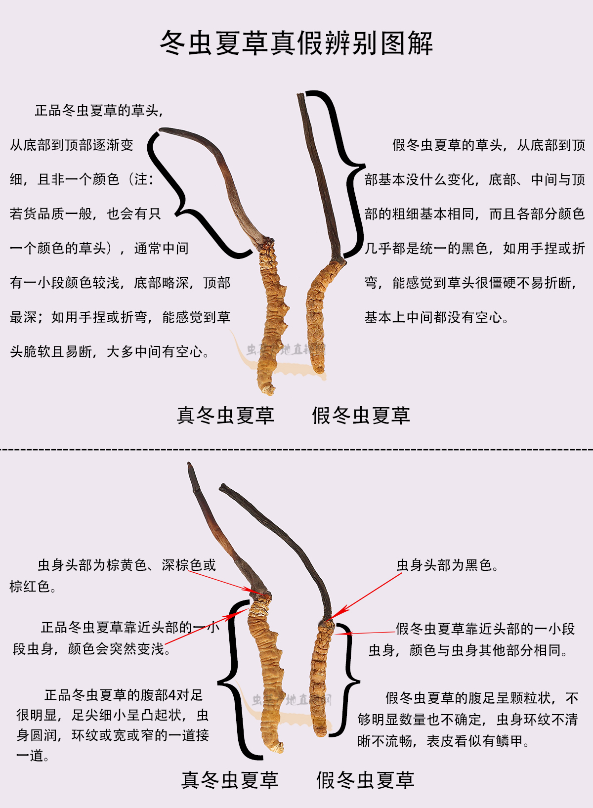 以上圖片,將這種產(chǎn)自四川和云南、極易被不法商家用來冒充正品的假冬蟲夏草與真冬蟲夏草的外形特征區(qū)別,介紹得非常清楚,相信大家在認真看過之后,就能避免買到這種假蟲草了。